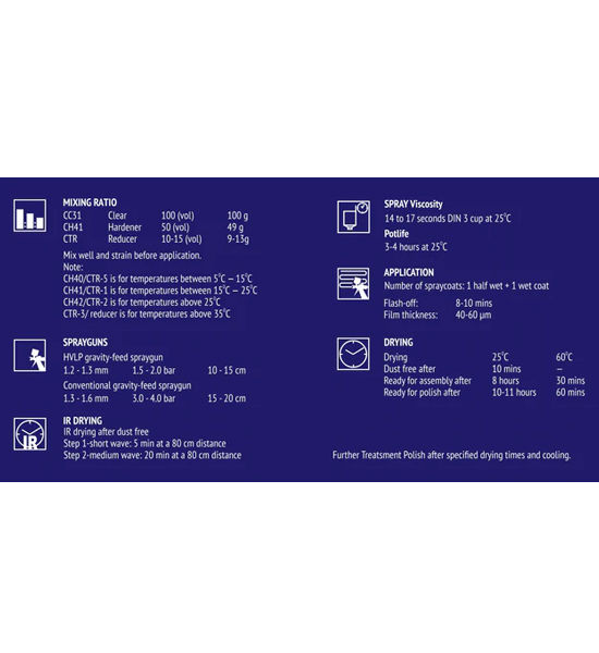 3P Crystalline™ CC31 is a 2.1 VOC, High Solid Euro-style, polyurethane clearcoat with a 2:1 mix ratio. CC31 is formulated to offer ease of application, fast dry and polish time, and exceptional gloss.